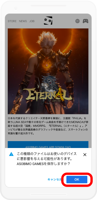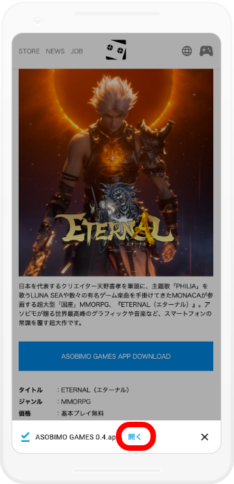 apkファイルのダウンロードが完了したら「開く」を選択してください