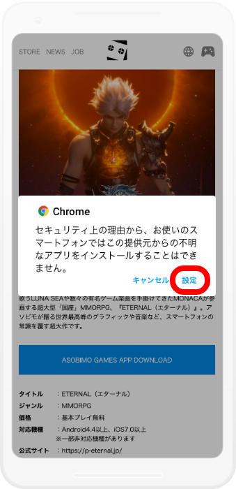 セキュリティ設定で提供元不明のアプリをダウンロードをブロックする設定をしている場合は、「設定」を選択します