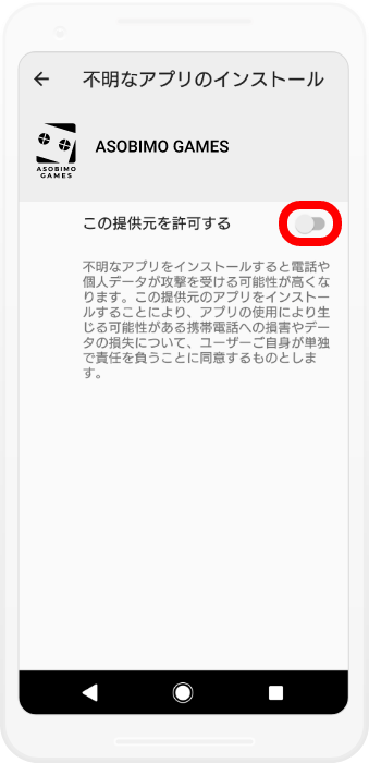 セキュリティ設定の画面に一度移行しますので、「この提供元を許可する」をONにします
