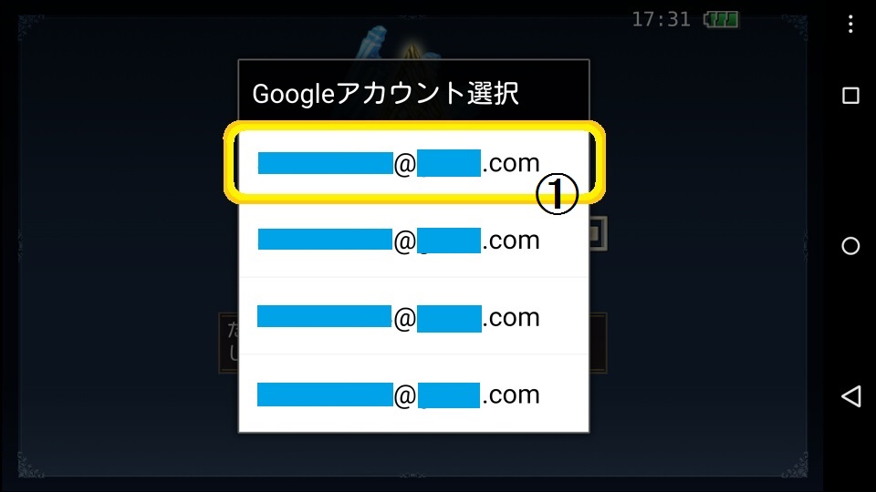 2. ゲームをインストールすると、起動時にAndroid端末でログインしている「Googleアカウント」の一覧が表示されますので、旧端末にてゲームをプレイする際に使用していた「Googleアカウント」をご選択ください。