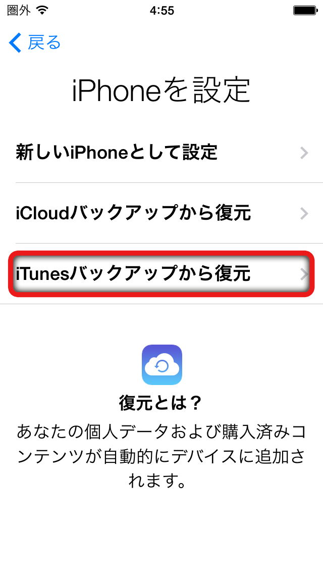 1.復元は新しいiOS端末のセットアップ時に、「iTunesバックアップから復元」をお選びください。