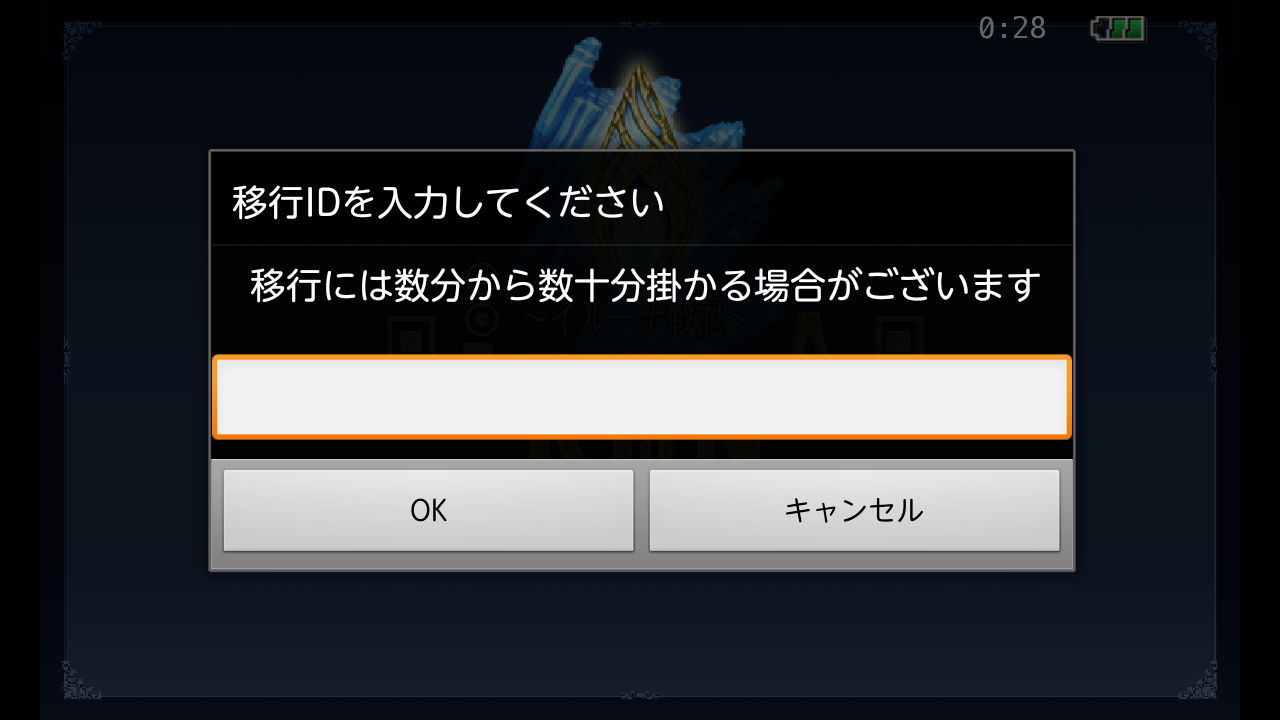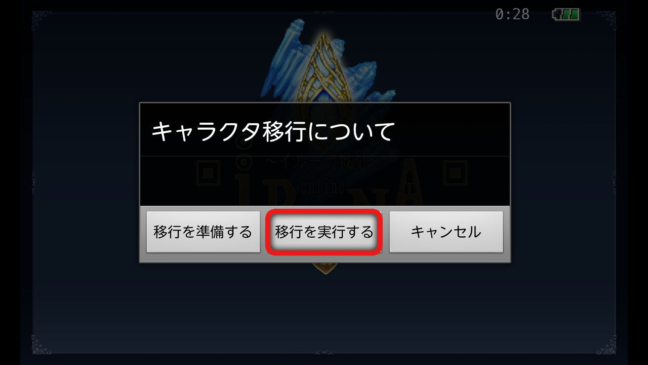 移行コードを入力して「移行実行」する際 : プレイ中のゲームデータに対し、上書きする形で移行が実行されます。